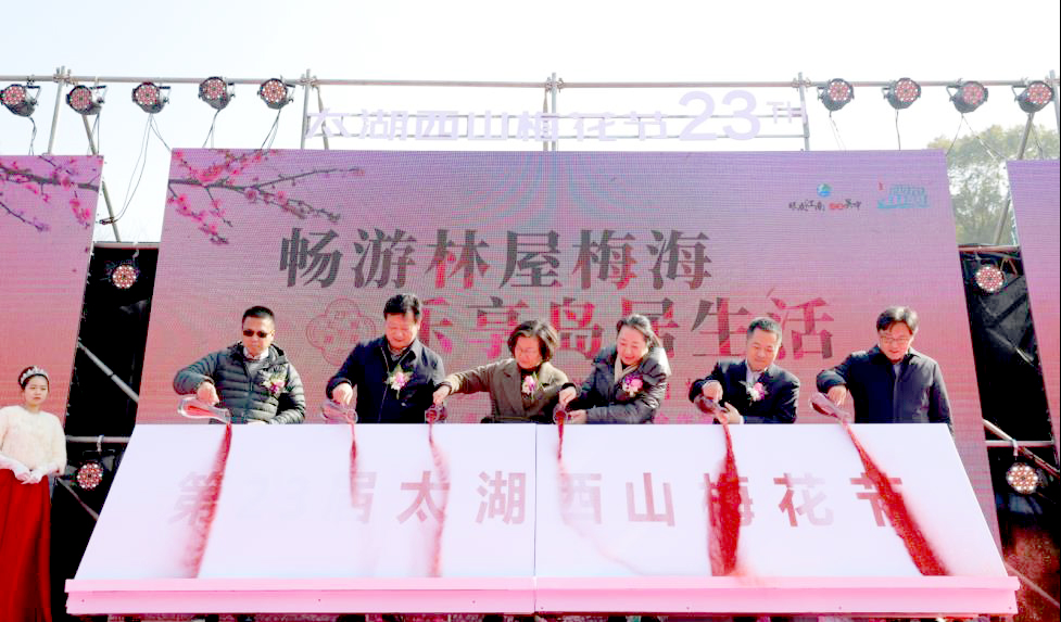 最后,吳中區(qū)政府副區(qū)長周黎敏女士、蘇州太湖國家旅游度假區(qū)黨工委委員、管委會(huì)副主任王曉嵐女士、西山農(nóng)業(yè)園區(qū)(金庭鎮(zhèn))、黨工委書記談建強(qiáng)先生、吳中區(qū)旅游局局長毛剛先生、金庭鎮(zhèn)人民政府鎮(zhèn)長姜昊先生、蘇州太湖國家旅游度假區(qū)文體旅游局局長戴小林先生上臺(tái)共同開啟第23屆太湖西山梅花節(jié)啟幕儀式.